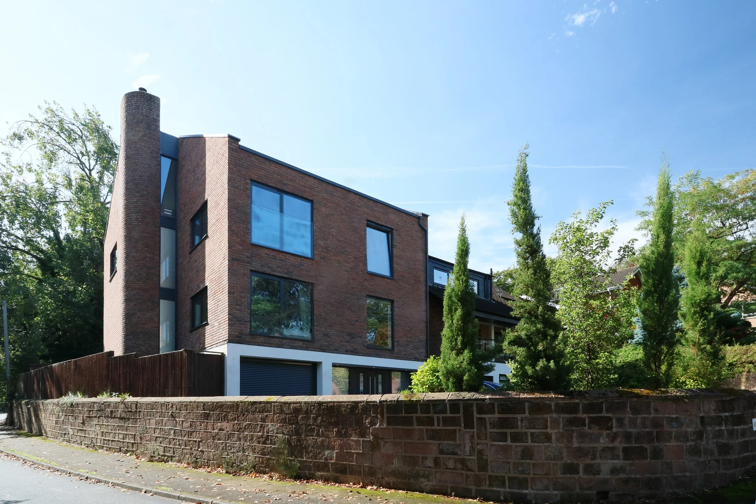 This contemporary four‑storey house in Woolton Hill, Liverpool sits on a red sandstone outcrop and steps up with the natural gradient of the landscape.